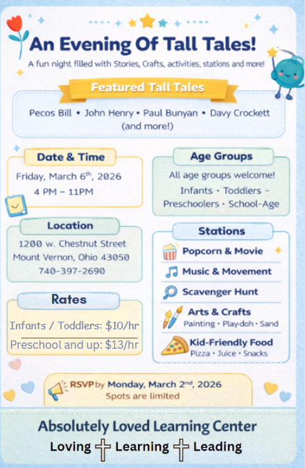 Childcare will take place at Absolutely Loved Learning Center, located at 1200 W. Chestnut Street, Mount Vernon, Ohio 43050. Our team will provide engaging activities and attentive care throughout the evening to ensure children are comfortable, happy, and well cared for.